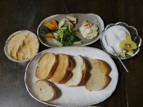 今朝は、カボチャ、しゃくし菜とラディッシュの浅漬け、ポテトサラダ、キウイのヨーグルトかけ🥝、トーストでした😋