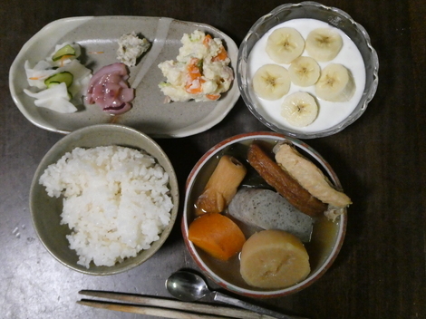 今朝は、カブときゅうりの浅漬け、イカの塩辛、わさび漬け、ポテトサラダ(ご近所様から)、バナナを入れたヨーグルト、おでん、ご飯でした😋