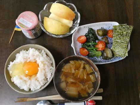 今朝は、ヨーグルト、🍎リンゴ、ミニトマト、ほうれん草、キュウリの漬物、味付けのり、味噌汁で卵かけご飯を食べました👍