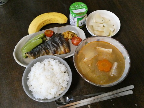 今朝は、バナナ、ヨーグルト、ヤーコン、寄せ鍋、ミニトマト、大根ハリハリ漬け、ホッケ、スナップエンドウで朝ごはんを食べました😋