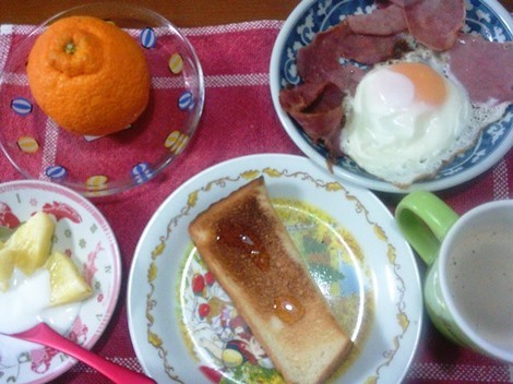 トースト(蜂蜜で)、カフェラテ、ベーコンエッグ、ヨーグルト、デコポン