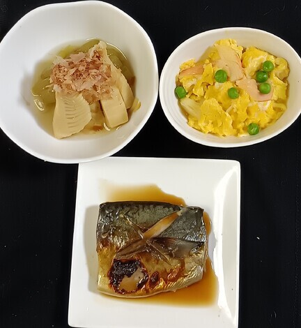 筍は道路沿いに店が出るほどあちこちで売ってます。蕗もサヤエンドウも出始めました。ので並べてみました。