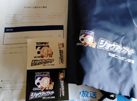 ショウアップナイター60周年ロゴ入りイベントリュックが当選しました。スポーツ少年の息子の道具入れに使いたいと思います。ありがとうございます😊