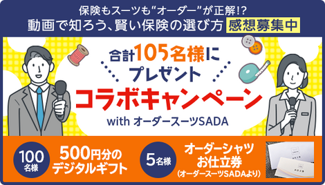 \締切迫る!/【合計105名様にプレゼント★コラボキャンペーンwithオーダースーツSADA】保険もスーツも“オーダー”が正解?!動画で知ろう、賢い保険の選び方<感想募集中>