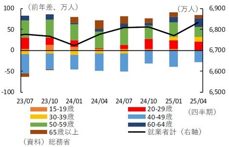 日本の就業者数は緩やかな増加傾向であり、足元では6,800万人程度です。ただし、年齢階層別の増減をみると20代、30代はそれぞれ前年比20万人、10万人程度の増加に過ぎません。40代が30~40万人の減少であるため、20~40代でみれば概ねゼロとなります。就業者数の増加は主に50代、および65歳以上の増加に支えられています。こうした動きは労働力人口で見ても同様です。人口動態から、魅力的な企業でなければ特に20~40代の採用は困難であり、採用後も転職してしまう状況が推察されます。