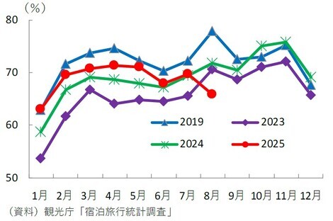観光庁によれば、今年8月の宿泊施設(従業員数10人以上)の客室稼働率(第一次速報値)は65.9%となりました。タイプ別には、ホテル系が概ね前年と同水準となるなか、旅館などが低めの水準でした。
