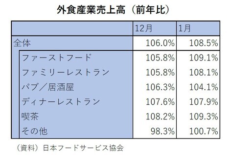 日本フードサービス協会によれば1月の外食産業売上高は、前年同月比で108.5%と前月から伸び率が上昇しました。客数は同105.2%(12月は同102.4%)となりました。業態別には、人気商品の復活などによりファーストフードのなかの「和風」、菓子商品とのコラボメニューなどによりファミリーレストランのなかの「洋風」などで、売上が高い伸びでした。パブ・居酒屋業態では、年始からの新年会需要が堅調で、月間を通じて個人・法人の小グループの利用が多かったとのことです。