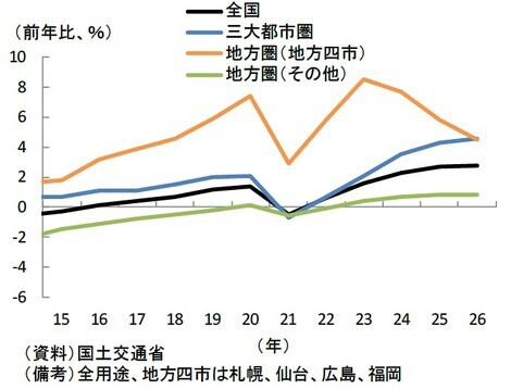 2026年1月1日時点の公示地価は、全用途平均(全国)が前年比+2.8%と、25年(同+2.7%)と概ね同じ上昇率となりました。内訳をみると、相対的な広さや職場環境と自然環境のバランスへの評価などから、高い上昇率が続いてきた地方の中核都市(地方四市:札幌、仙台、広島、福岡)では、土地代や建築コストなどの上昇と販売価格のバランスもあってか、上昇率が落ち着いてきました。三大都市圏については、東京圏・大阪圏の商業地が高めの上昇率となったことを受けて、上昇率がやや加速しました。