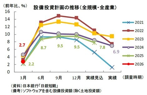 3月調査の日銀短観によれば、2025年度の企業の設備投資計画(土地投資を除き、ソフトウェアを含む)は前年比+7.8%となりました。24年度計画と似た形で推移しており、着地も同+7%程度と予想されます。