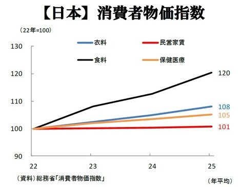 基本的な生活コストである「衣食住」は3年前と比較してどの程度、上昇したのでしょうか。最も目立つのは食料で、2割の上昇となっていますが、衣料も1割弱の上昇です。一方、民営家賃については東京都内を中心とした新規募集家賃の上昇が報道されていますが、継続入居時も含めた全国平均では、まだ限定的な上昇です。