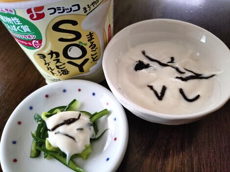千切りしていたキュウリに塩こんぶ入りSOYヨーグルトを混ぜて食べました。