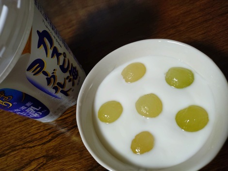 皮が苦手なのでシャインマスカットの皮をむいてカスピ海ヨーグルトに入れました。