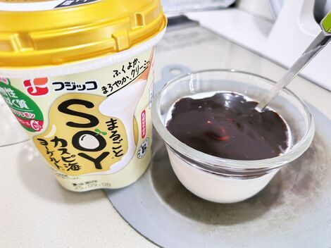 ①「まるごとSOYカスピ海ヨーグルトのチョコレートソース混ぜ」