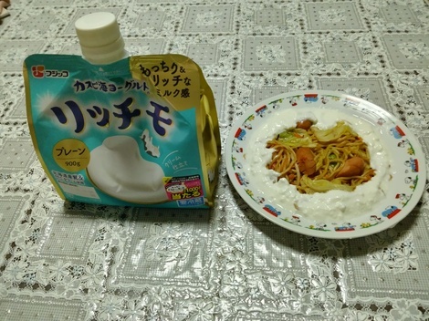 リッチモを今回はソース焼きそばの廻りに配置して,混ぜ合わせて戴きました。カロリーが押さえられ,よりヘルシーに食しました。チョッと甘さも感じました。