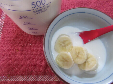 朝、出来立てのカスピ海ヨーグルトにバナナ入れて食べています