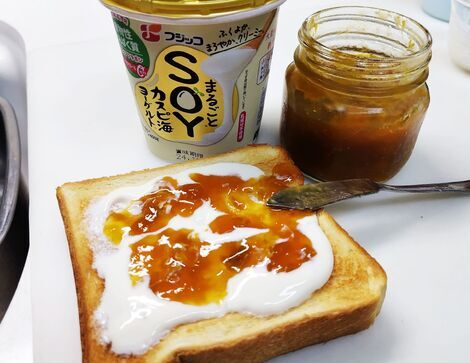 ①焼き立てトーストにSOYカスピ海ヨーグルトをタップリ塗って、梅酒漬けた残りで作った自家製梅ジャムをだらーりと。梅の酸味を緩和して美味しいんだけど、梅ジャム付け過ぎて歯が浮いて痛いです。