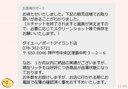 「現状ご好評につき、品薄のこともあるため、販売店検索で表示された店舗に