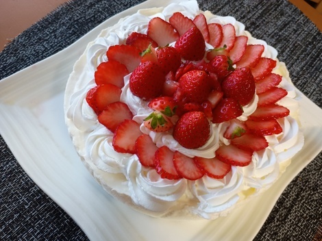 いつものレアチーズケーキより、ヨーグルト多めに入れて作りました!苺やクリームは全て中学生の娘のセンスにお任せして作ってもらいました