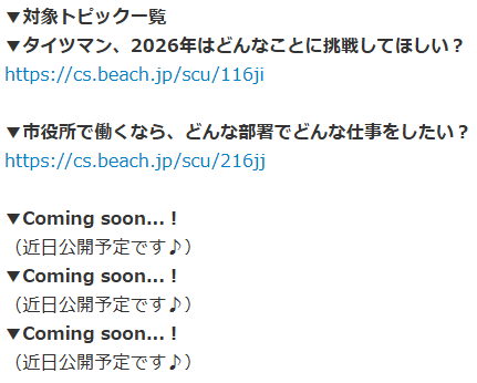 12月15日になっても、予定の3つのトピックが、『▼Coming soon...! (近日公開予定です♪)』のままですね。実施期間終了の12月25日(木)まであと10日。今から新しく3つのトピックが立つならば、年末のこの時期ちょっと忙しいですね。