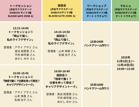移住に少しでも興味のある方、岡山県に縁がある方、岡山の特産品が好きな方、自分の人生の新たなライフデザインを考えている方など、どなたも大歓迎♪11月15日に、ぜひ「渋谷サクラステージ」にお立ち寄りください。これからの人生の過ごし方、働き方、生活について考えるヒントが満載ですよ。