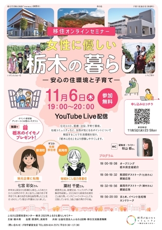 今回は11月6日(木)19時開催の女性向けオンライン移住セミナー「女性に優しい栃木の暮らし―安心の住環境と子育て―」のご紹介です!