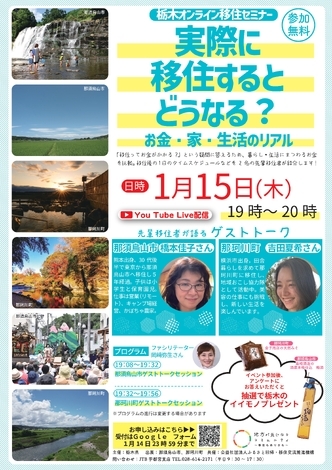 本セミナーでは「移住ってお金がかかる?」という疑問に答えるため、那須烏山市と那珂川町の先輩移住者2名にご出演いただき、暮らし・生活にまつわるお金を比較。移住後の1日のタイムスケジュールなどをお話しいただき、移住に関する素朴な疑問などを経験をもとに解説します♪