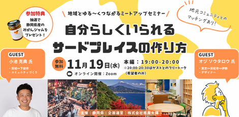 ■11月19日(水)「自分らしくいられるサードプレイスの作り方」セミナーの詳細・お申し込みはこちら⇩