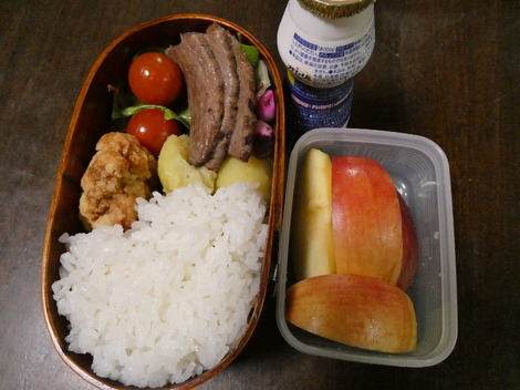 今日のは、ミニトマト、野菜サラダ、焼き肉、しそニンニク、ジャガイモ、から揚げ(冷凍)、白菜とひき肉のこめ油炒めです😋