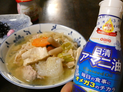 今朝は、昨夜の鶏の水炊きにアマニ油をひとまわししました(^m^)/