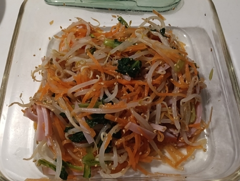 もやし、人参、ハムの中華サラダ…ごま油+ポン酢で簡単ドレッシングを作りました(^^)❤️