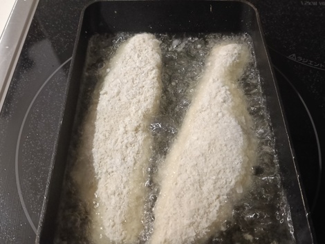 キャノーラ油で鮭フライを揚げました(^^)鮭フライのサイズが大きくて、卵焼き器を揚げ鍋に代用♪ピッタリサイズでした!