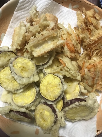 日清キャノーラ&オリーブを使ってさつまいも、ちくわ、かき揚げ