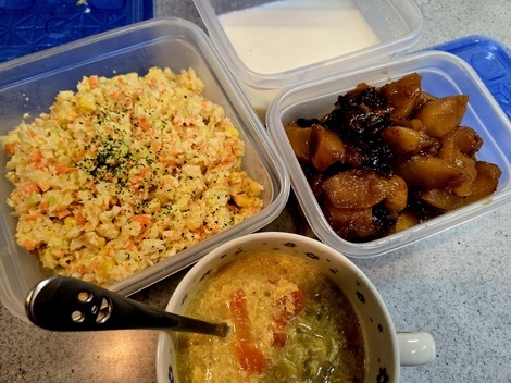 残り野菜をオリーブオイルで炒めて、卵とじスープを😋🐭🎈