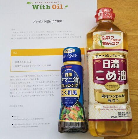気になっていたアマニ油ドレッシングと、好んで使っているこめ油だったので、応募しました♪