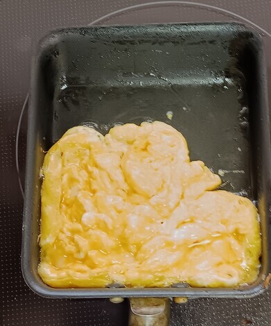 形を整えると玉子焼きの完成です。縁から少し油が泡のように見えます。油も調味料の一つ。ふんわりと仕上がります。