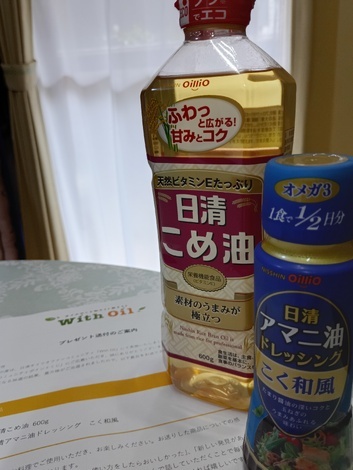 2月分のポイントくじに当選して、こめ油とアマニ油ドレッシングを頂きました。先月に続き今月もはずれと思っていたので、嬉しいお届け物となりました。とても嬉