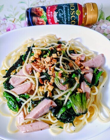 パスタをガーリックオイルで炒めて