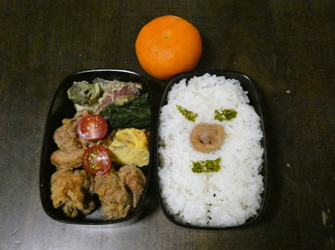 もうちょっとかわいい顔の弁当にしようと思ったのですが、ちょい悪親父になってしまいました…😅