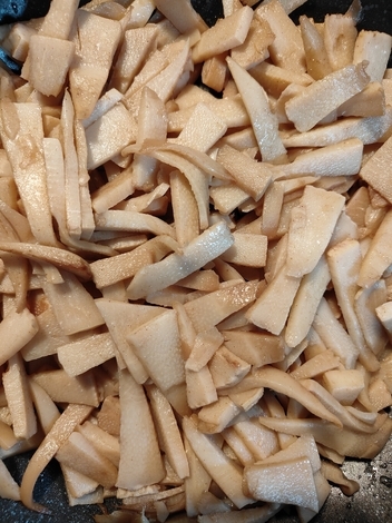 日清こめ油で、薄く細かく切った たけのこを炒め、粉末かつお出汁、粉末昆布出汁で出汁の味をきかせ、甜菜糖少々、醤油少々で薄味にしています。このまま食べてもいいし、炒飯の具にしてもいいし、青椒肉絲もどきなど、色々に使えて便利です♪