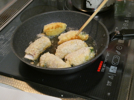 今夜は娘が、コメ油で鶏ささみ・大葉・梅肉・チーズ揚げ焼きを