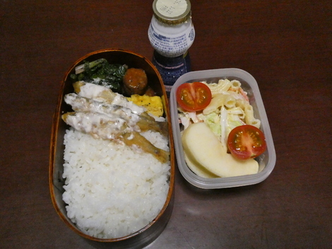 今日は、ほうれん草胡麻和え、ワカサギ唐揚げマヨネーズ、ミートボール、厚焼き玉子、ミニトマト、マカロニサラダ、リンゴ(^m^)/