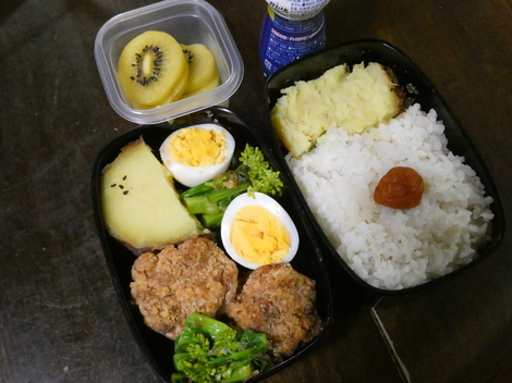 今日は、さつま芋、ゆで卵、菜の花おひたし、鶏唐揚げ、さつま芋、梅干です(^m^)/