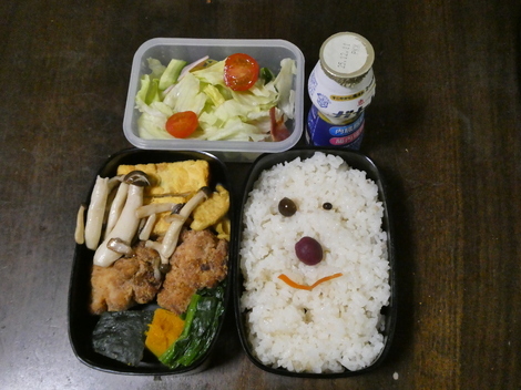今日は、ヤサイサラダ、小梅、厚焼き玉子、キノコソテー、鶏唐揚げ(スーパー:冷凍)、カボチャ、ほうれん草、大根ハリハリ漬け、飲むヨーグルトです(^m^)/
