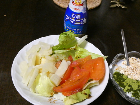 今日はサラダに市販のドレッシングではなく、オリーブオイル+塩コショウでサラダに