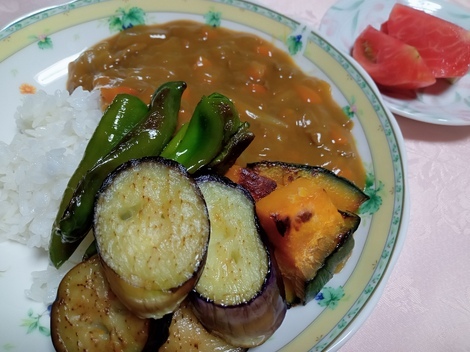 久しぶりの実家カレー(^^)牛肉いりの甘口カレーに、夏野菜のトッピングがたっぷりでした♪