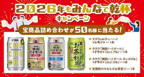 期間中、<大広間><タカラcanチューハイの間><タカラ「焼酎ハイボール」の間>の3つのお部屋で、それぞれ1回以上コメントを投稿してくださった方の中から、50名様に「宝商品詰め合わせ」をプレゼント!