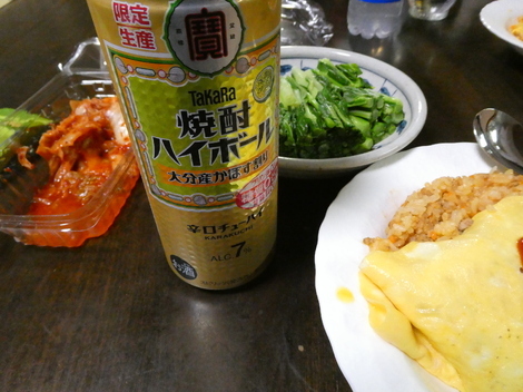 今夜は、白菜キムチ、かき菜、オムライスなどを食べながら大分産かぼす割りを飲みました👌
