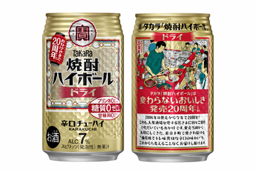 『タカラ「焼酎ハイボール」』20周年を記念して、3月上旬から『タカラ「焼酎ハイボール」〈ドライ〉・〈レモン〉』と『タカラ「焼酎ハイボール」キレの5%』の〈ドライ〉・〈レモン〉が、限定パッケージデザインの「20周年缶」になっています♪