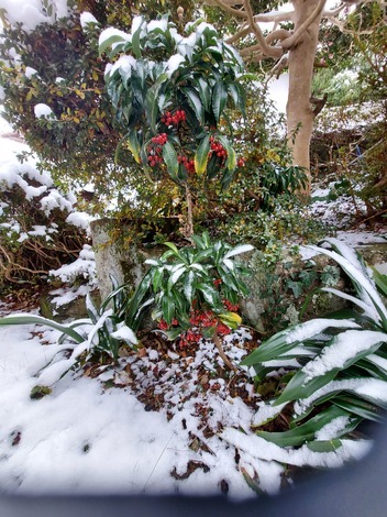 庭の一番向こうの3段の木がサザンカで、その下に万両があります