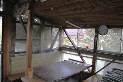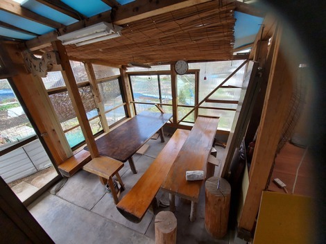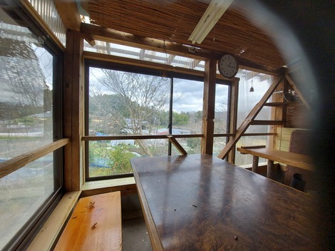 上の画面だと、左側の波板をと腰の化粧ベニヤを取り外し、斜めの木を途中で切りサッシ戸にしたもの 2年前にDKのテーブルを2.4mに替えたので、DKの1.8mものを設置していた。 先月18日に完了